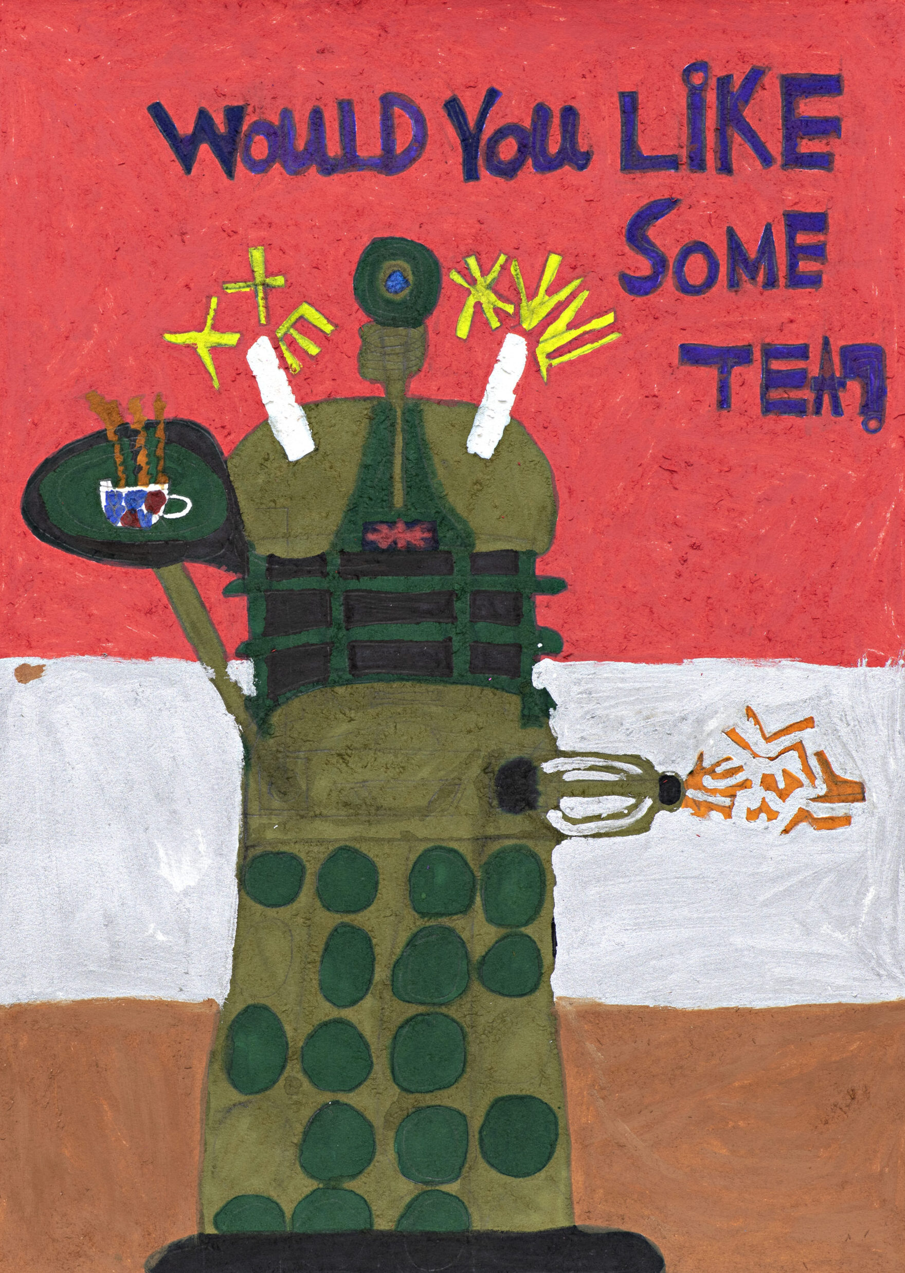 A figurative artist that works from his imagination, he creates his exaggerated characters, coming up with elaborated titles for his confident and quirky work. There is also a personal element, where he inserts himself into the narratives, adding text that often incorporates his name.