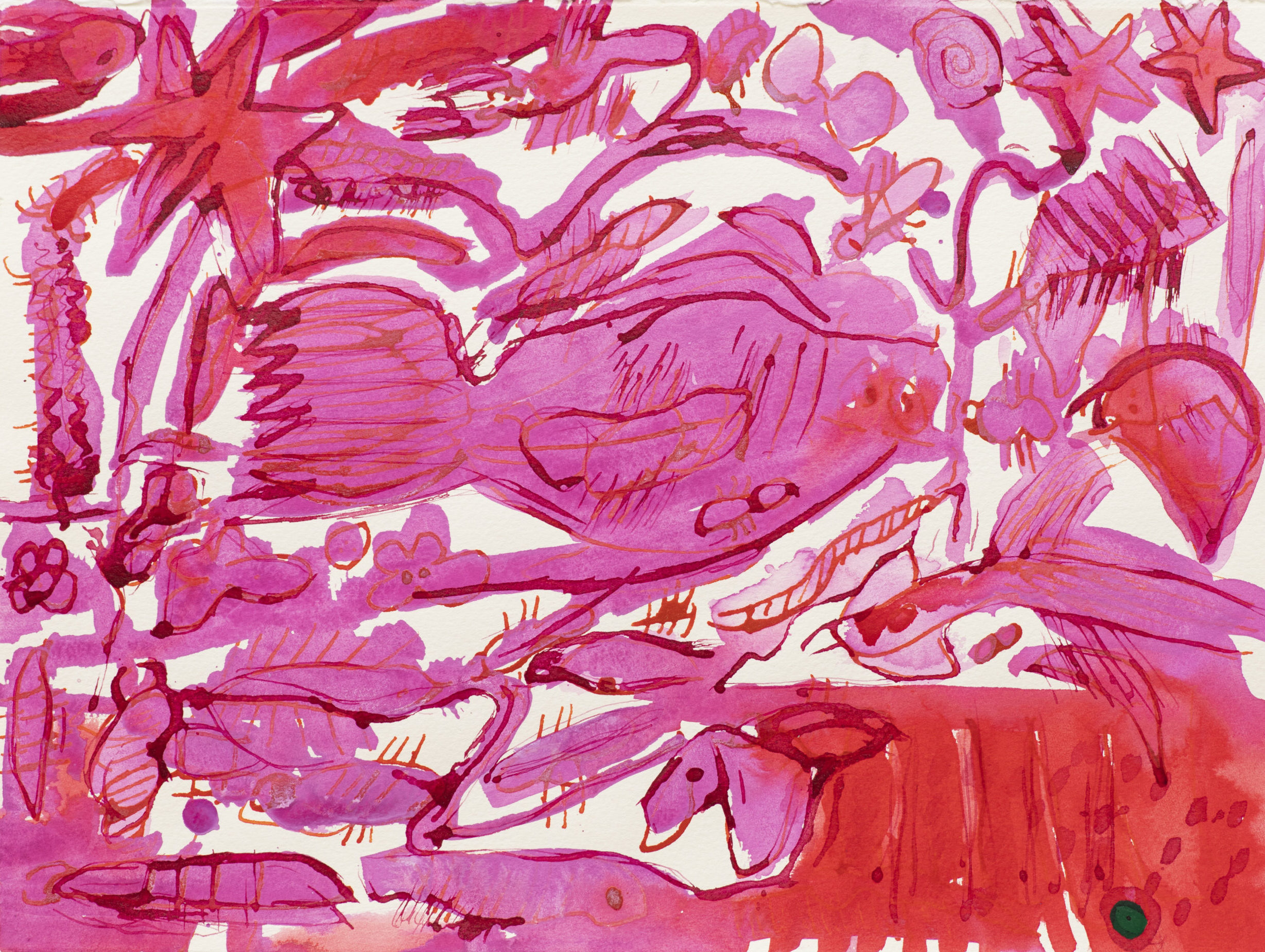 Utilising strong drawing skills and working predominantly with inks and watercolour, Nhan Nguyen builds increasingly complex narrative layers from simple imagery.