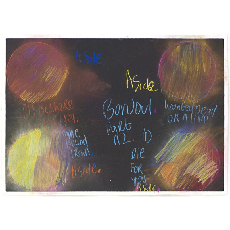 Cameron Gresswell is an emerging artist working in acrylic and pastel on paper. With a strong thematic focus on music, the works depict colourful lyrics, names of artists and bands floating and falling across the page. Often around two brightly coloured records, the artworks give the impression the viewer has a birds-eye view of an active mixing deck. Gresswell has worked at Arts Project Australia since 2016 and has exhibited in Arts Project Australia’s annual group exhibitions. His work is held in private collections.