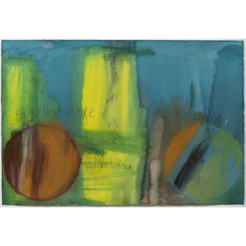 Cameron Gresswell is an emerging artist working in acrylic and pastel on paper. With a strong thematic focus on music, the works depict colourful lyrics, names of artists and bands floating and falling across the page. Often around two brightly coloured records, the artworks give the impression the viewer has a birds-eye view of an active mixing deck. Gresswell has worked at Arts Project Australia since 2016 and has exhibited in Arts Project Australia’s annual group exhibitions. His work is held in private collections.