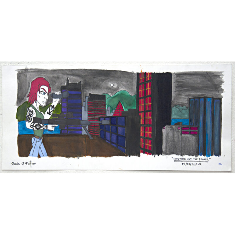 Gavin Porter is an emerging artist with a graphical style that focuses on zines, narrative and mythical map driven drawings. With a satirical sense of humour and meticulous planning, his artworks present colourful illustrations in fine liner and marker on paper, as well as black and white ink drawings. His practice explores social and political dichotomies recurring characters engage in the eternal struggle between good and evil, as well as post-apocalyptic survival.