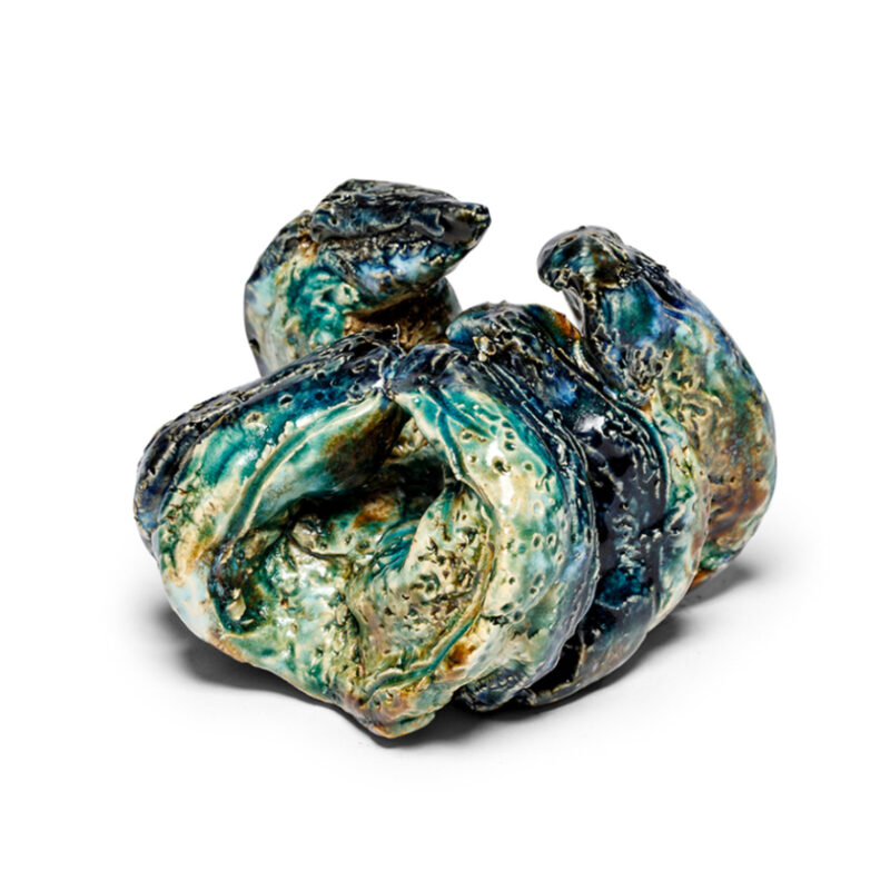 Bronwyn Hack is known for her multi-faceted practice which spans sculpture, painting, printmaking and ceramics. Her 2D works merge subject and background to form a consolidated linear perspective. Throughout her career, she has maintained an interest in animals, particularly dogs, as well as the body and bones. Her soft sculpture focuses on sections of the body, the anatomical creations made with brightly coloured thread and fabric and often finished with faux fur, beads, and sequins. Hack’s ceramic work draws on the key themes across her practice, including animals, bones, and popular culture references.