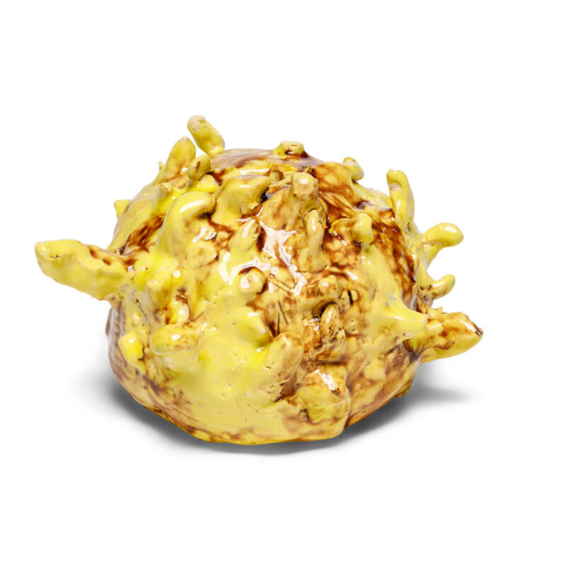 Bronwyn Hack is known for her multi-faceted practice which spans sculpture, painting, printmaking and ceramics. Her 2D works merge subject and background to form a consolidated linear perspective. Throughout her career, she has maintained an interest in animals, particularly dogs, as well as the body and bones. Her soft sculpture focuses on sections of the body, the anatomical creations made with brightly coloured thread and fabric and often finished with faux fur, beads, and sequins. Hack’s ceramic work draws on the key themes across her practice, including animals, bones, and popular culture references.