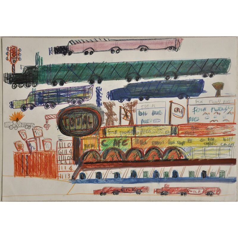 Steven Perrette is a mid-career artist whose small and mid-scale works on paper frequently depict frenetic workings of the western world. Throughout his career, he has maintained a fascination with industrial and vintage ships and sailing boats as well as country roads and highways that he travelled with his father when he was a young child. Perrette has worked at Arts Project since 2000 and had his first solo exhibition in 2011. He has exhibited in numerous group shows and has work in the National Gallery of Australia, City of Moreland and V-Line collections.