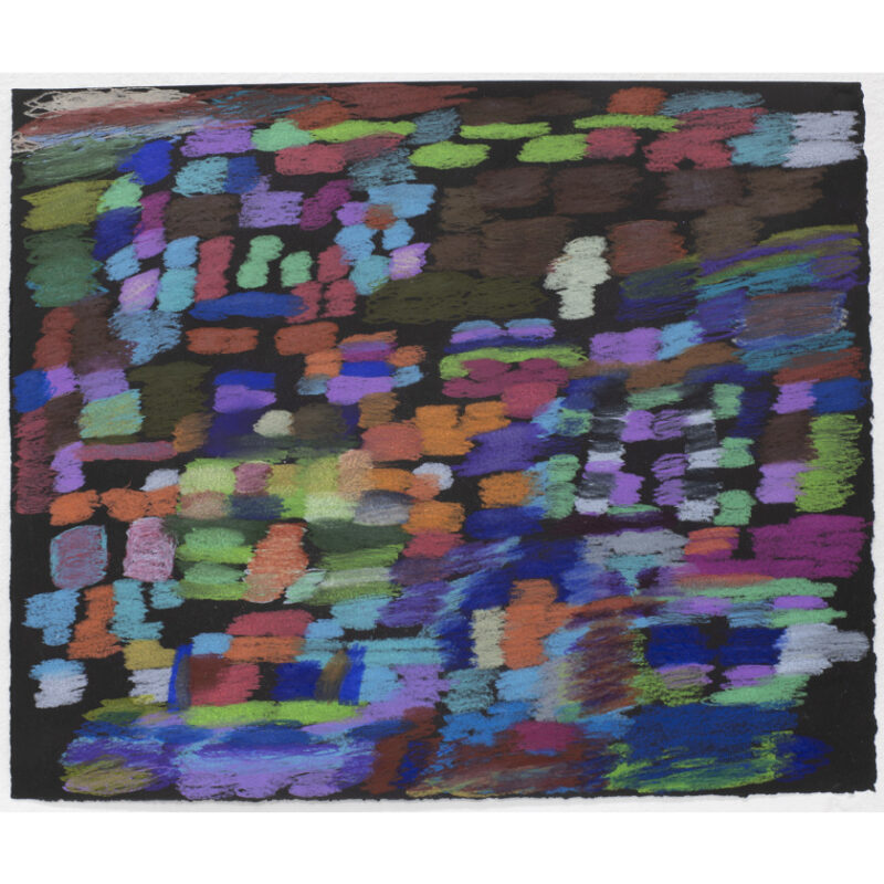 Sam Forster is an emerging artist whose miniature pictograms incorporate repetitive patterns of dots and text to form complex visual symbols creating a personal vernacular for subjects of interest, such as popular television shows My Kitchen Rules and Home and Away and objects from everyday life, like houses, cars and flowers. Working primarily with dry pastel on black paper, his coloured dots and symbols glow like lights in the darkness, offering just enough visual familiarity to suggest a landscape.