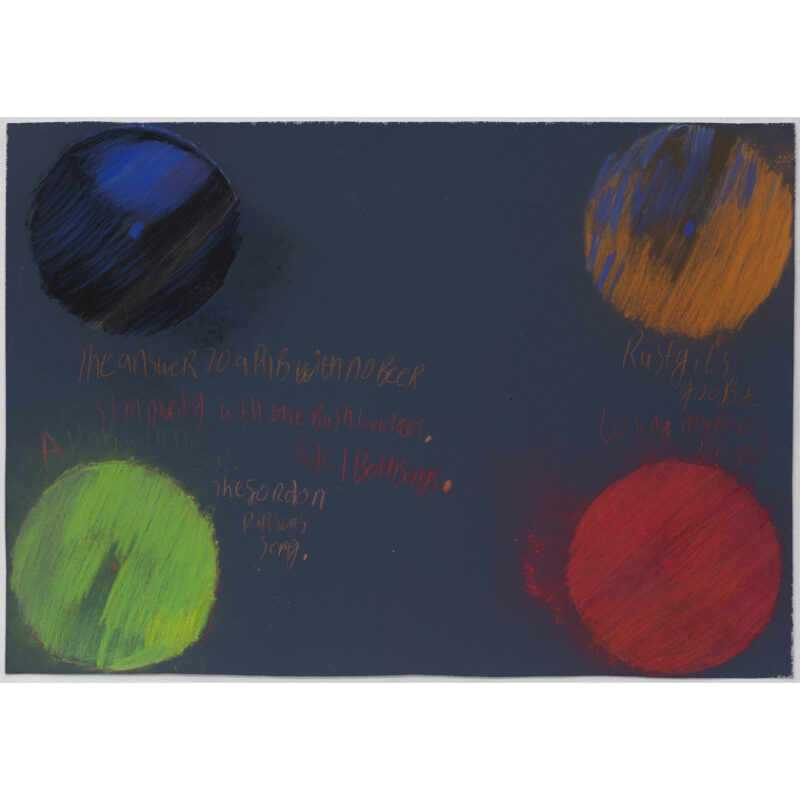 Cameron Gresswell is an emerging artist working in acrylic and pastel on paper. With a strong thematic focus on music, the works depict colourful lyrics, names of artists and bands floating and falling across the page. Often around two brightly coloured records, the artworks give the impression the viewer has a birds-eye view of an active mixing deck. Gresswell has worked at Arts Project Australia since 2016 and has exhibited in Arts Project Australia’s annual group exhibitions. His work is held in private collections.