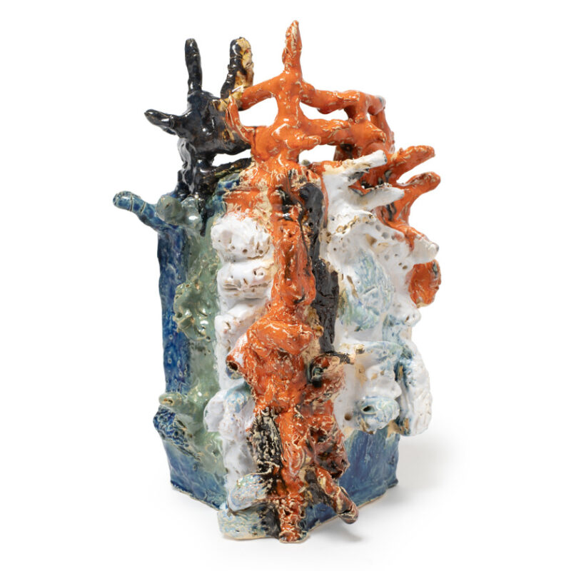 Bronwyn Hack is known for her multi-faceted practice which spans sculpture, painting, printmaking and ceramics. Her 2D works merge subject and background to form a consolidated linear perspective. Throughout her career, she has maintained an interest in animals, particularly dogs, as well as the body and bones. Her soft sculpture focuses on sections of the body, the anatomical creations made with brightly coloured thread and fabric and often finished with faux fur, beads, and sequins. Hack’s ceramic work draws on the key themes across her practice, including animals, bones, and popular culture references.