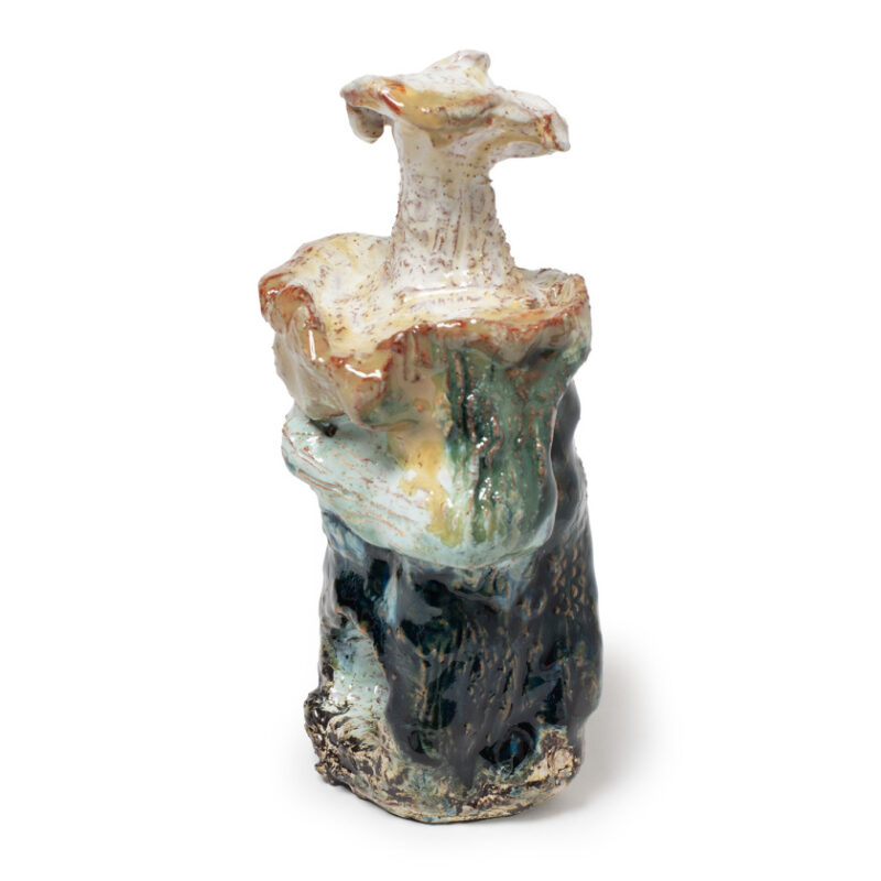 Bronwyn Hack is known for her multi-faceted practice which spans sculpture, painting, printmaking and ceramics. Her 2D works merge subject and background to form a consolidated linear perspective. Throughout her career, she has maintained an interest in animals, particularly dogs, as well as the body and bones. Her soft sculpture focuses on sections of the body, the anatomical creations made with brightly coloured thread and fabric and often finished with faux fur, beads, and sequins. Hack’s ceramic work draws on the key themes across her practice, including animals, bones, and popular culture references.